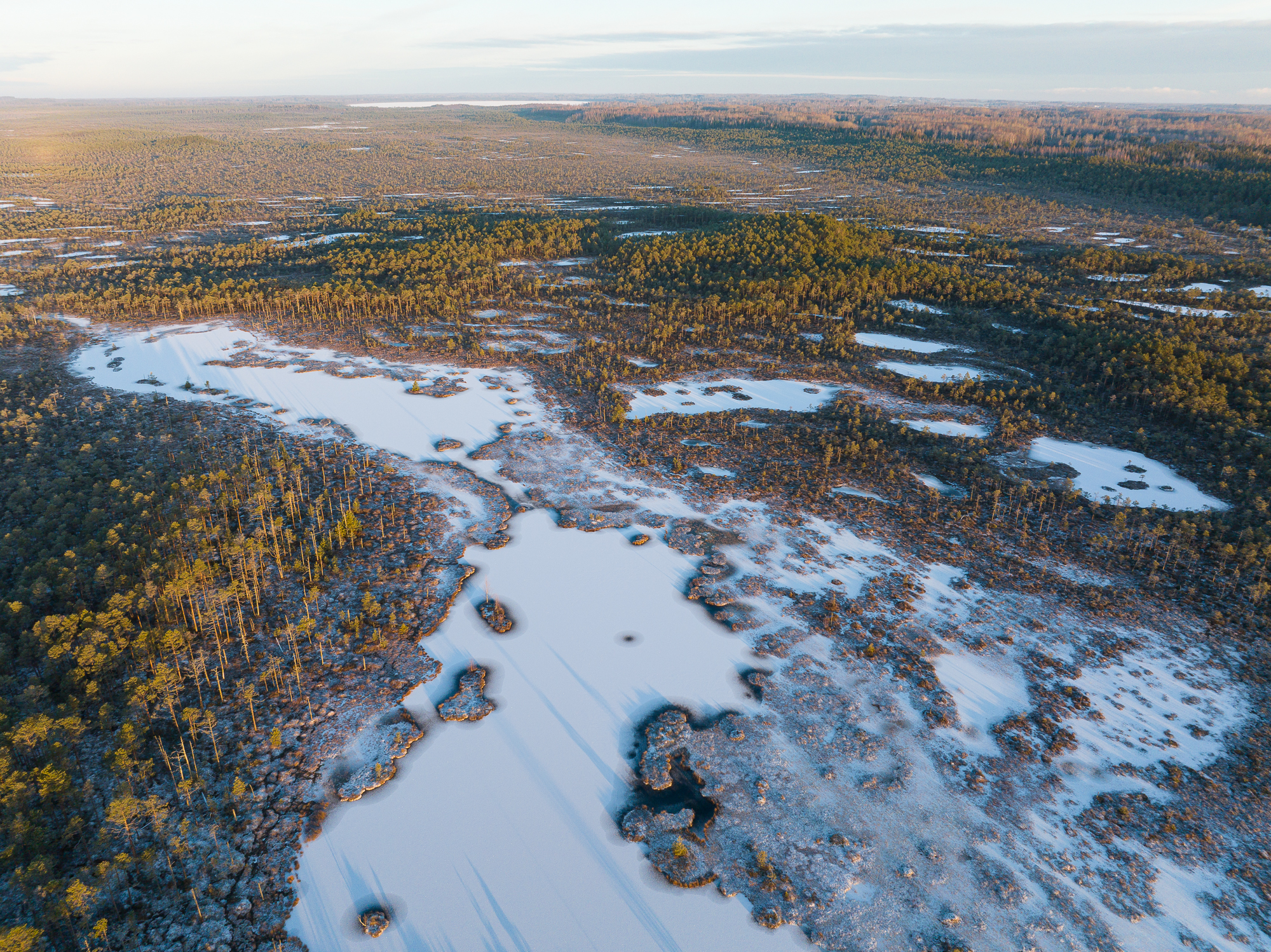 Tegelikult oli plaanis minna laugastel olevat värsket jääd ja sealseid mustreid pildistama, kuid öösel maha sadanud õhuke lumekiht kattis laugastel olema pidanud jäämustrid täielikult. Maapinnast mitmekümne meetri kõrguselt vaadates tõi valge lumi aga huvitava laugaste süsteemi esile.